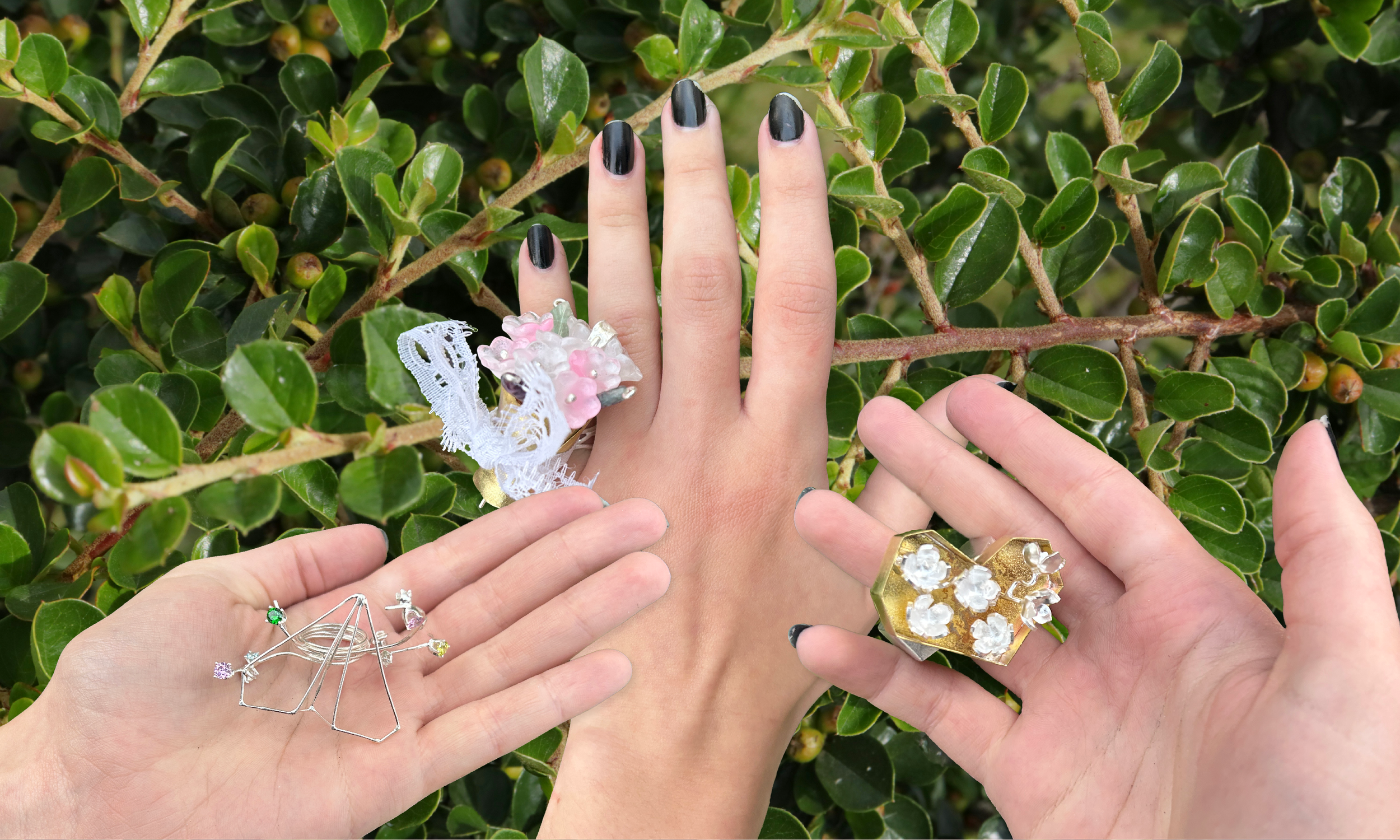 Through this project, I explore jewelry as a medium for identity, emotion, and storytelling, challenging traditional definitions of adornment. Using mixed materials such as glass, lace, brass, and sterling silver, each ring carries personal meaning: an airplane symbolizes my experience as a foreigner, a reimagined tulip bouquet represents affection, forgiveness, and renewal, and a flower shadow box preserves memories tied to meaningful moments.